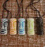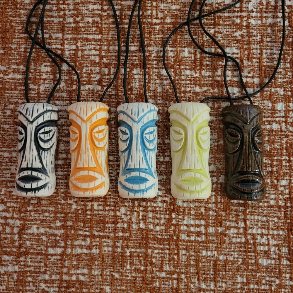 Ceramic Stoneware Tiki pendant strung up with approximately 27" of black cord. This pendant was sculpted by yours truly and each individual one is handmade with my name on the back.. available in assorted colors. Each pendant is approximately 2.75 inches from end to end. They are hollow so they're not too heavy.